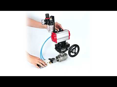 Ball valves Elephant BV3232P(2pc)-FP-T-ISO-H, body material - Stainless steel AISI 316, seal - PTFE / PTFE / Teflon, with pneumatic actuator double action PA-DA, 4V320-10 220V, handwheel MON, ATU AFC2000