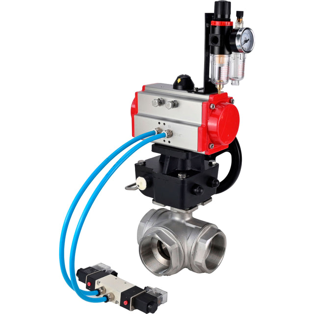 Ball valves Elephant BV3232P(4pc)-SP-3WL-T-ISO-H, body material - Stainless steel AISI 316, seal - PTFE / PTFE / Teflon, with pneumatic actuator double action PA-DA, 4V320-08 220Vhandwheel MON, ATU AFC2000