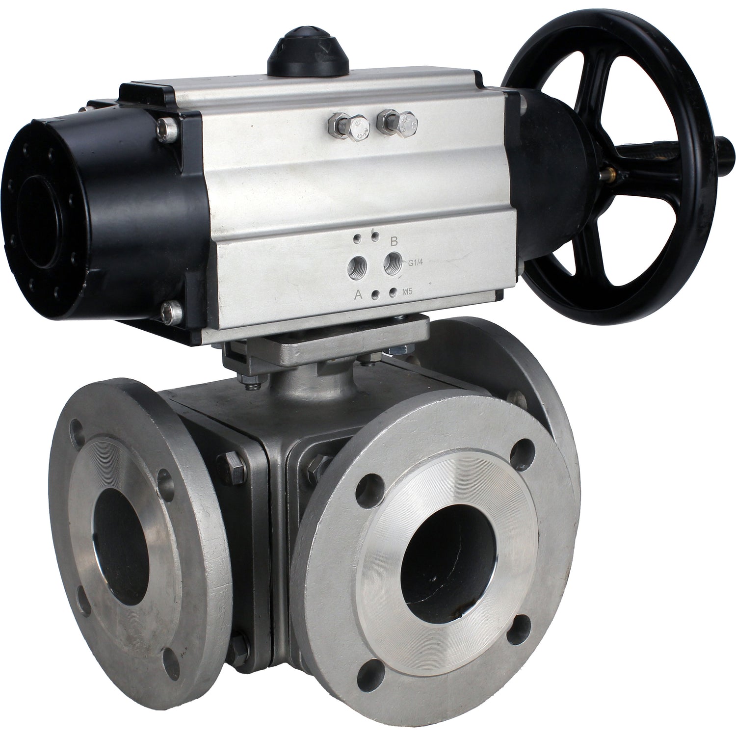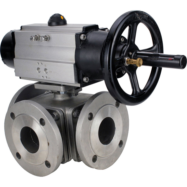 Ball valves Elephant BV3232P(4pc)-FP-3WL-F-ISO-H DN100 16 bar full bore, flanged, body - stainless steel SS316, ISO flange F10/F12, square 19x19, with double pneumatic actuator PA-DA-105-1 actions - DN100 / 16 bar is backordered and will ship as soon as it is back in stock.