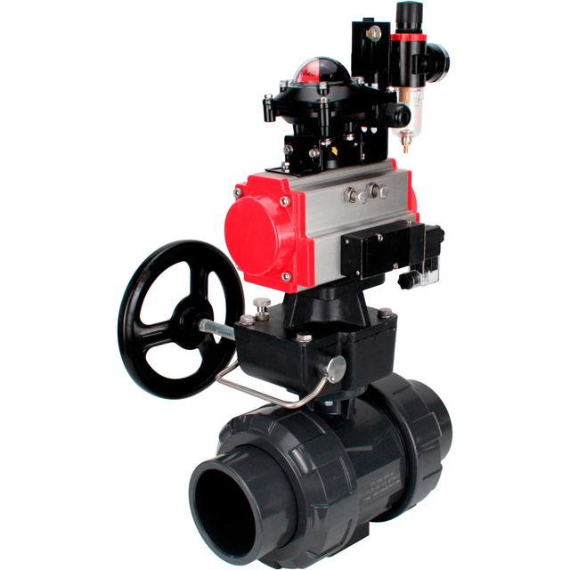 Ball valves Elephant BV4242E-FP-GRM-ISO, body material - UPVC, ball material - UPVC, seal - EPDM, with pneumatic actuator double action PA-DA, pneumatic distributor 4M310-08 24V, LSU APL-210N, ATU AFC2000 and handwheel MON