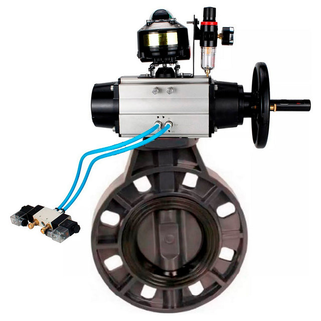 Butterfly valves Elephant WBV4242E-2W-Fb-ISO, body material - UPVC, disc material - UPVC, seal - EPDM, with pneumatic actuator double action PA-DA-105-1, pneumatic distributor 4V320-10 220V, LSU APL-510N EX and ATU AFC2000