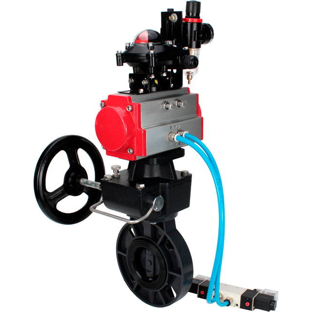 Butterfly valves Elephant WBV4242E-2W-Fb-ISO, body material - UPVC, disc material - UPVC, seal - EPDM, with pneumatic actuator double action PA-DA, pneumatic distributor 4V320-08 220V, LSU APL-210N, ATU AFC2000 and handwheel MON