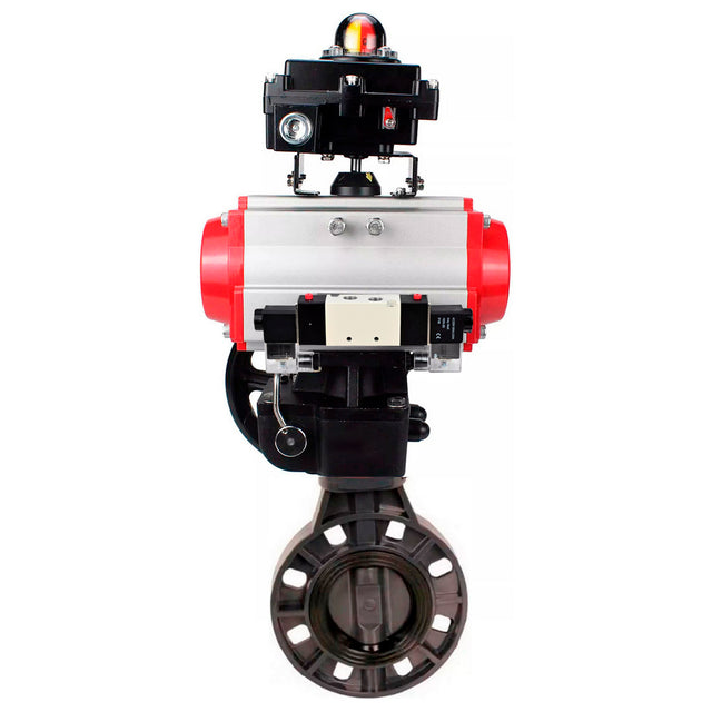 Butterfly valves Elephant WBV4242E-2W-Fb-ISO, body material - UPVC, disc material - UPVC, seal - EPDM, with pneumatic actuator double action PA-DA, pneumatic distributor 4V320-08 220V, LSU APL-410N EX and handwheel MON
