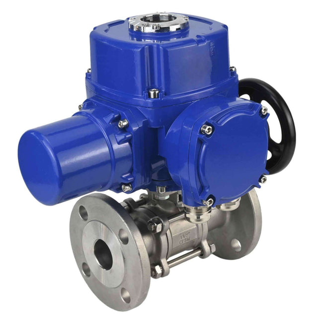 Stainless steel ball valve Elephant BVFPT,304,180 three-part, body material - stainless steel SS304, seal - PTFE, flanged, full port, quarter-turn electric actuator Elephant QT-W (M) 380 V